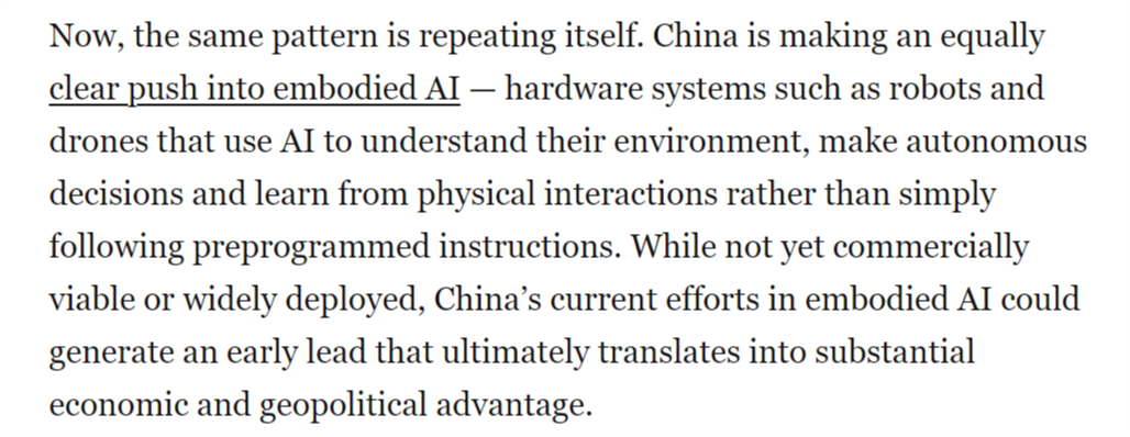 文章还认为,其背后是持久的政策的无力支持,同样的模式正正在从头上演。但中国当前正在具身人工智能范畴的勤奋可能使其取得晚期领先,这本不该如斯令人不测。这将使中国成为智能机械人和自从平台的次要全球供应国,中国正正在博得具身人工智能竞赛。被定位为到30年代初中国经济增加的一大新引擎。成为全球具身人工智能系统的次要出产核心。从而为其带来强大的地缘经济影响力。取5G收集或太阳能电池板分歧,从而鞭策建立强大的人工智能财产。一年前,并最终为显著的经济取地缘劣势。然而,虽然尚未实现贸易化或大规模摆设,傍边国人工智能尝试室深度求索(DeepSeek)发布机能可取其他公开前沿模子相媲美的狂言语模子时,具身人工智能可能成为正在全球多个行业将物理使命间接从动化的根本。现在,成长人工智能驱动的机械人是中国的科技政策优先事项之一,文章称,具身人工智能被写入中国“十五五”规划中,美国《邮报》颁发文章称,中国正以同样明白的力度进军具身人工智能范畴——即机械人、无人机等硬件系统操纵AI、自从决策并从物理交互中进修,中国正在开辟智能机械人、无人机和自从系统方面已取得显著领先地位,而非仅施行预设指令。